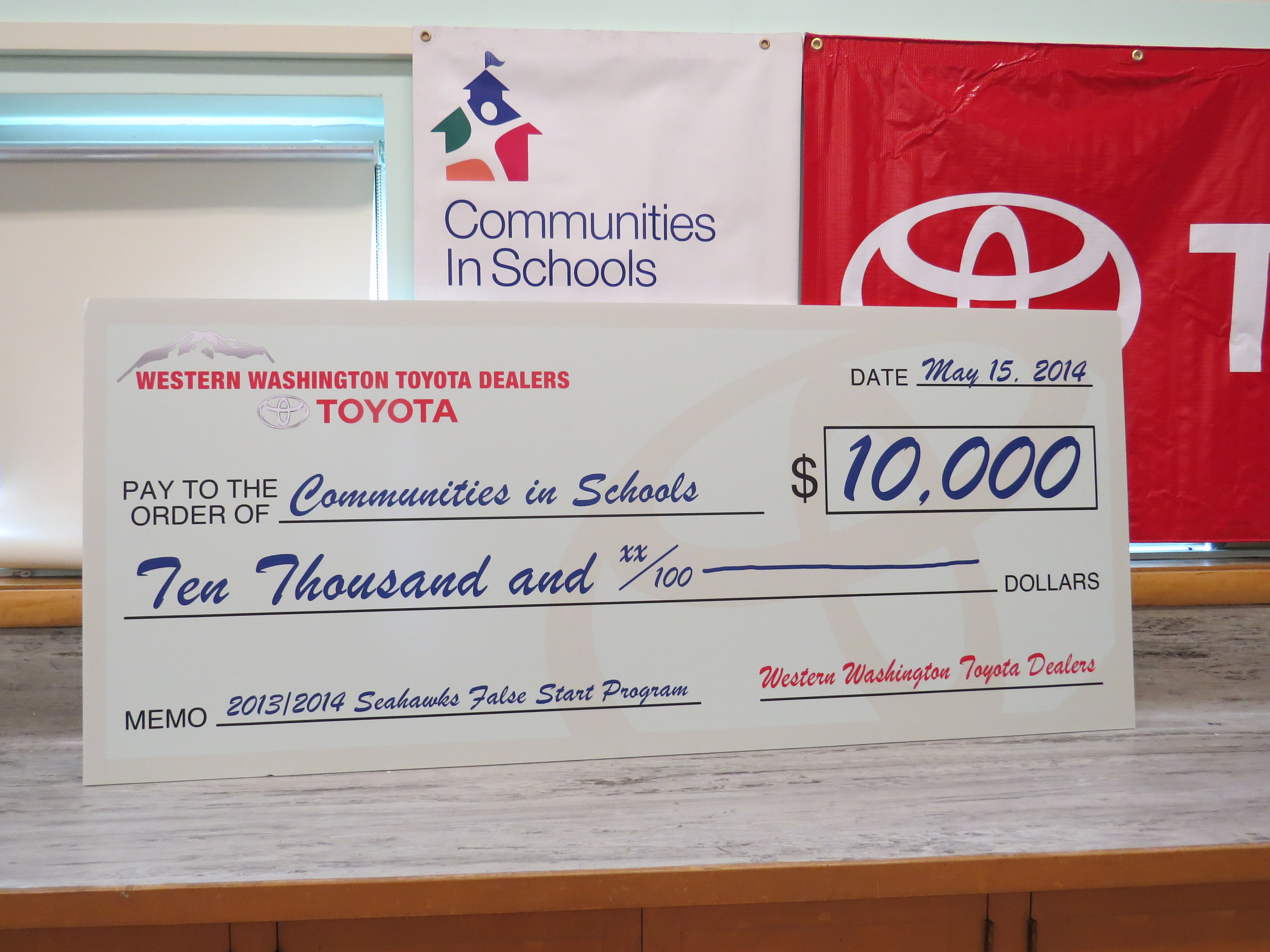 The Western Washington Toyota Dealers Association celebrated the Seahawks’ championship season with a $10,000 donation Thursday to Communities in Schools of Washington.